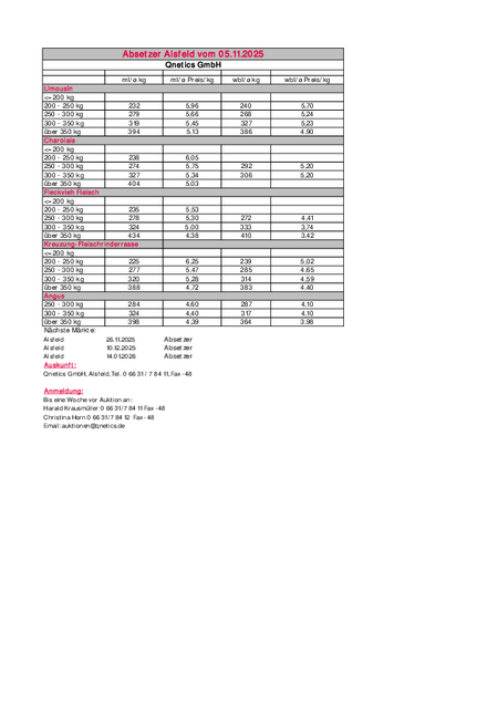Ergebnisse Absetzerauktion Alsfeld vom 05.11.2025