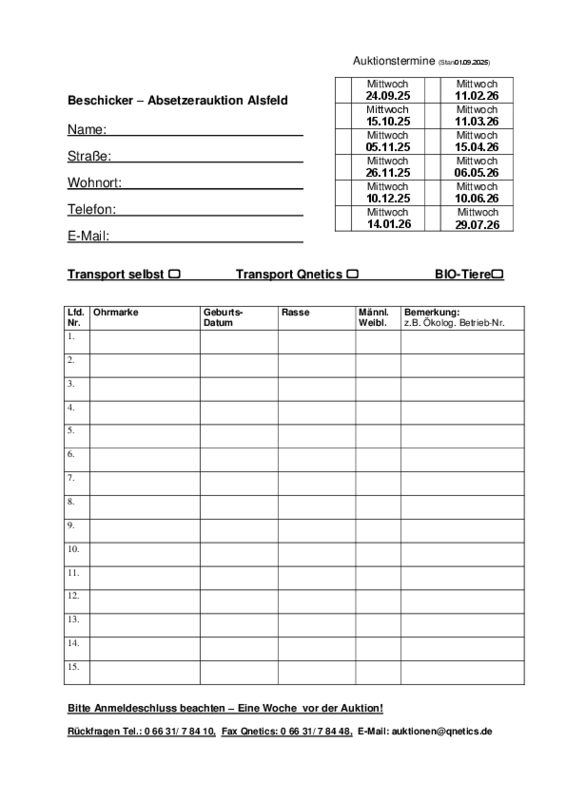Anmeldung für die Absetzerauktion in Alsfeld bis eine Woche vor Auktion an: Tel. 06631 784-11 (Harald Krausmüller) oder 06631 784-12 (Christina Leimbach) oder Fax -48, Email: auktionen@qnetics.de