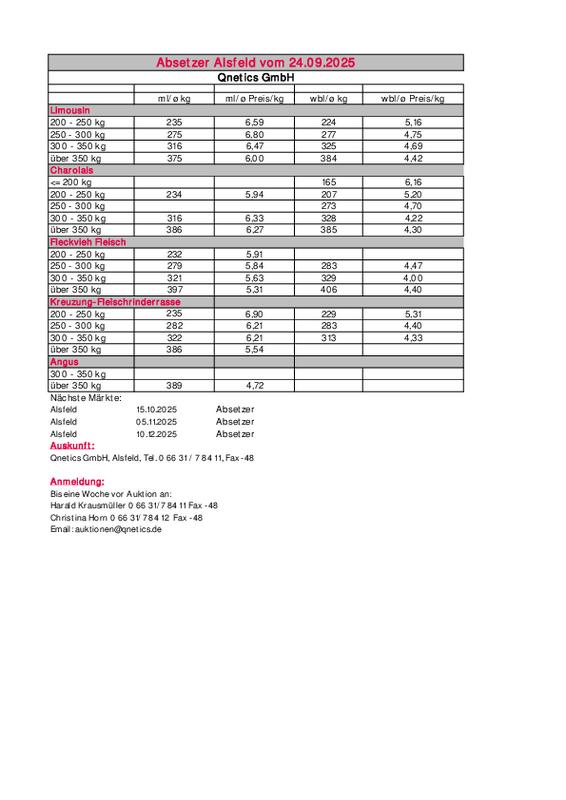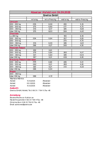 Ergebnisse Absetzerauktion Alsfeld vom 24.09.2025