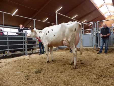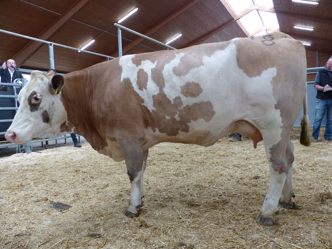 Kat-Nr. 18: Körperstarke Fleckviehfärse mit einem sehr starken Euter von Frank Hofmann, Gersfeld, erzielte den Spitzenpreis von 3.200 €.