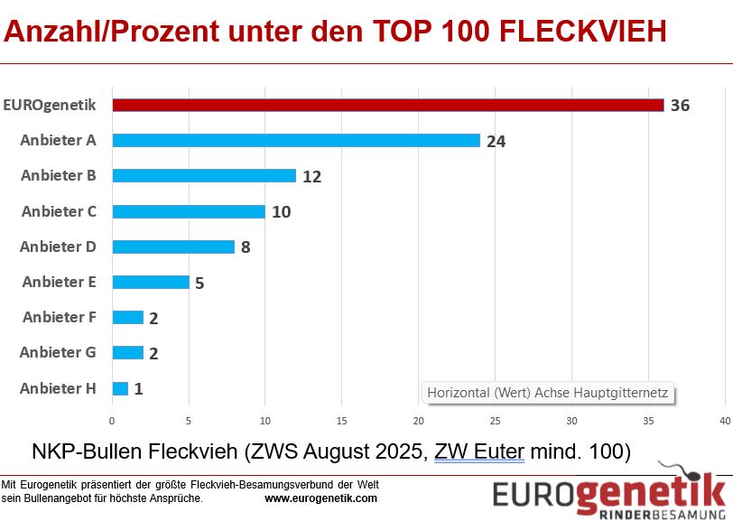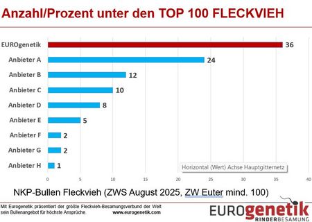 Ein zentrales Thema war die Rekrutierung der besten Genetik, also die Aufstallung von 127 Fleckvieh-Stieren im Berichtsjahr. Etwa die Hälfte dieser Stiere wurde auf den Märkten in Deutschland und Österreich angekauft, die andere Hälfte entweder bereits als Kälber erworben oder stammt aus Vertragssystemen der Basisorganisationen mit ihren Züchtern. Besonders erfreulich war der gestiegene Anteil natürlich hornloser Genetik: 61 % der Stiere sind mittlerweile genetisch hornlos, davon 28 % reinerbig. Diese Entwicklung unterstreicht das Ziel der EUROgenetik, Tierwohl und Zuchtfortschritt nachhaltig zu verbinden.