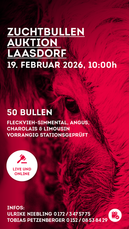 Am 19. Februar 2026 findet unsere Fleischrinder-Bullenauktion im Vermarktungszentrum Laasdorf statt. Angeboten werden vorrangig stationsgeprüfte Bullen der Rassen Angus, Charolais, Fleckvieh-Simmental und Limousin.