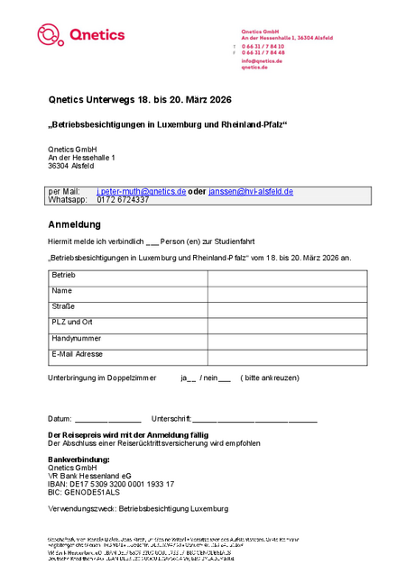 Organisation: Abfahrt ist An der Hessenhalle 1 in 36304 Alsfeld, Parkplätze stehen zur Verfügung, je nach Fahrtstrecke ist ein Zustieg in Absprache möglich. Die Übernachtungen, die Busfahrt und die Gastgeschenke der besuchten Betriebe sind im Preis enthalten. Das Mittagessen und Abendessen reservieren wir im Vorfeld, wird dann vor Ort selbst gezahlt.