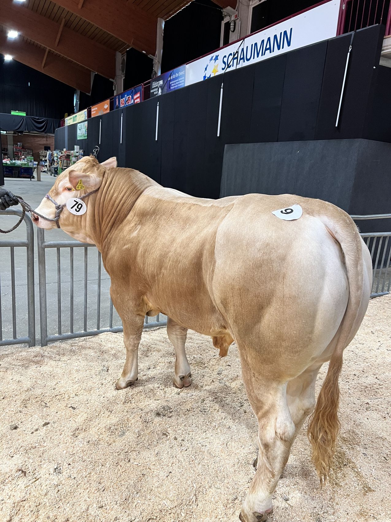 Blonde d`Aquitaine: Ein ausgeglichener sehr gut bemuskelter Bulle, der mit reinerbiger Hornlosigkeit ausgestattet ist.