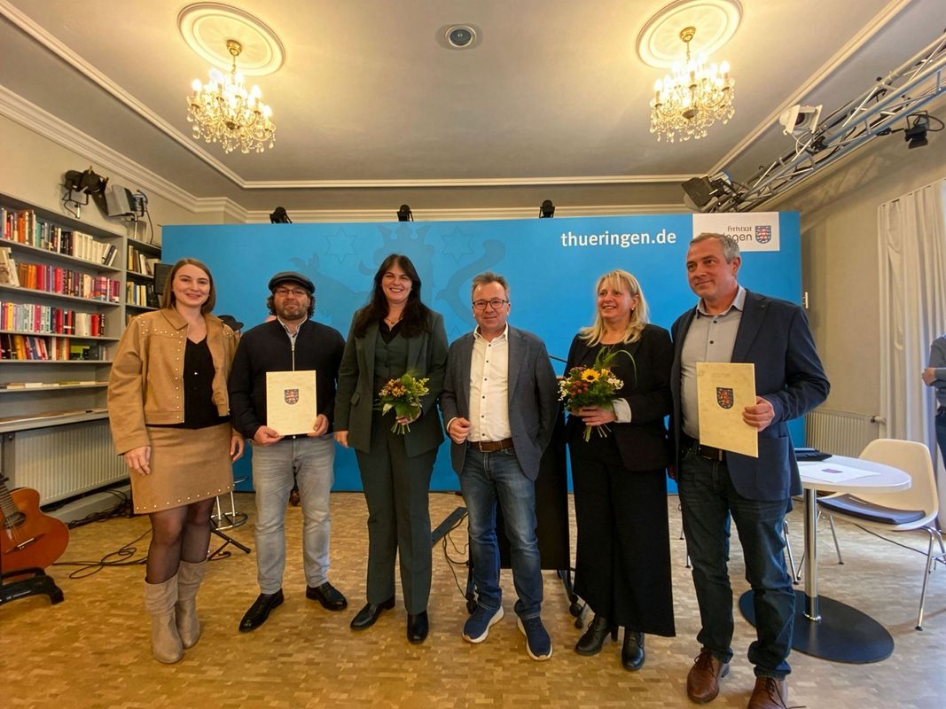 Katharina Schenk (Thüringer Ministerin für Soziales, Gesundheit, Arbeit und Familie), Marcus Recknagel und Isabel Schmidt (Agrargesellschaft mbH Hermannsfeld), Dr. Klaus Wagner (Präsident des Thüringer Bauernverbandes), Kathlen und Axel Spindler (Landei Ilmtal GmbH) ( v. l.).
