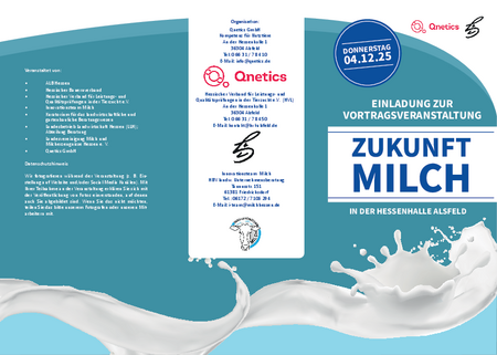 Am Donnerstag, den 4. Dezember findet die von der Qnetics GmbH, vom Hessischen Verband für Leistungs- und Qualitätsprüfungen und dem Innovationsteam Milch organisierte Vortragstagung „Zukunft Milch“ in der Hessenhalle Alsfeld statt. Beginn ist 10.00 Uhr. Teilnahmegebühr: 25,- € pro Person (inkl. Mittagessen). Alle Mitglieder und Interessierte sind herzlich eingeladen. Allen Vorträgen schließt sich eine Diskussion zum Thema an. Bitte beachten Sie auch die zahlreichen Informationsstände in der Hessenhalle.